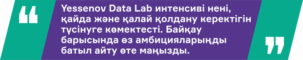 Yessenov Data Lab бағдарламасында оқып жүрген кезде біздің топта медицина саласынан келген, бағдарламалау бойынша мүлде тәжірибесі жоқ небәрі екі адам ғана болды. Курстастарымнан қалып қоймау үшін көп еңбектенуге тура келді. Өз бетімше білім алуға үйренгенмін, сондықтан YouTube платформасында көптеген сабақтар қарап, басқа адамдар жазған кодтарды талдап, оларды қайталап жазып отырдым. Материалды тереңірек түсіну үшін жасанды интеллект құралдарын да белсенді қолдандым. Әрине, топтағы достарымның, ассистенттердің және оқытушылардың қолдауы да үлкен көмек болды. Қажет кезде көмек сұрау – бұл қалыпты нәрсе.